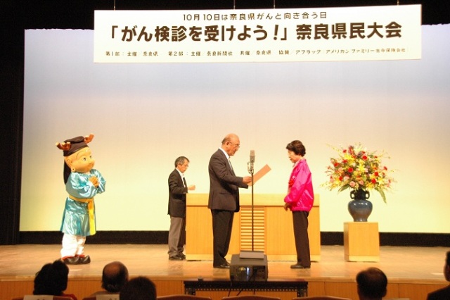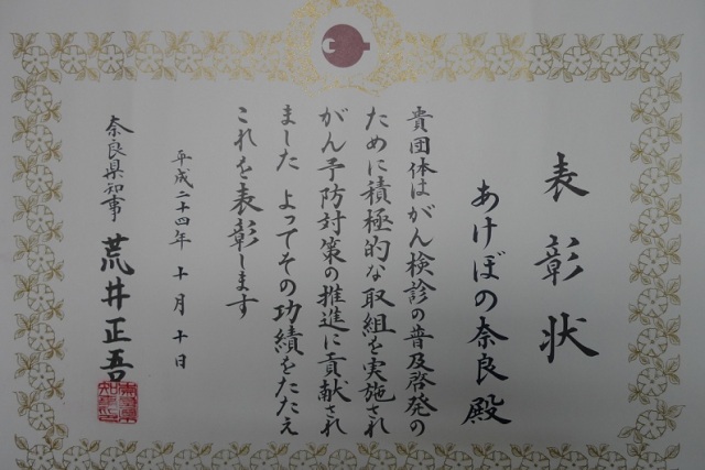 2011年10月にがん条例が出来た時、10月10日を奈良県がんと向き合う日と定められました。2012年(平成24年)10月10日「がん検診を受けよう!奈良県民大会」が開催され、「あけぼの奈良」が第1番目に知事賞を受賞しました。