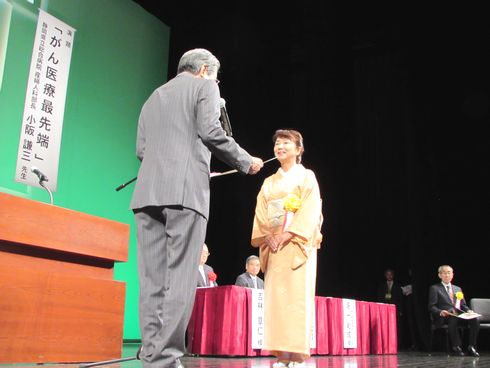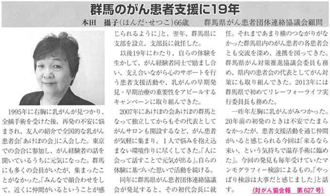 2015年9月4日、群馬県で開催された「がん征圧全国大会」にて、日本対がん協会賞を頂きました。思えば、あけぼの群馬の代表として、会に支えられ、ワット会長に叱咤激励されながら、皆さんと一緒に今日まで歩んできました。この度の受賞で、多くの方に応援され、見守っていただいたことを改めて知り、感謝の気持ちで一杯です。身に余る体験でしたが、素直に嬉しい出来事でした。(本田記)