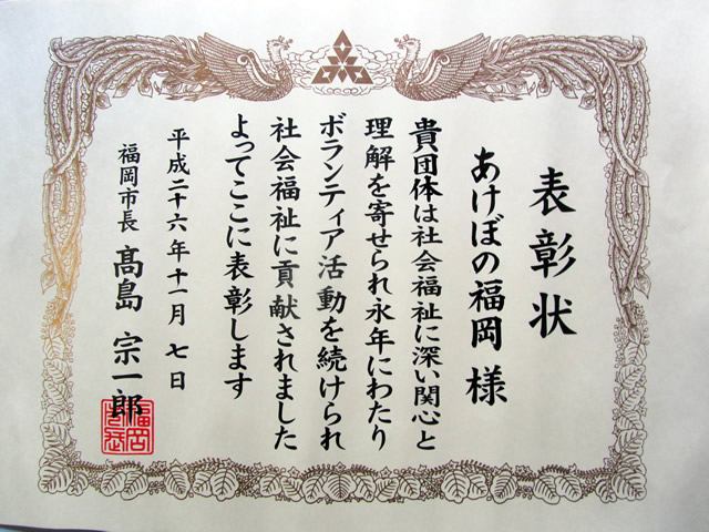 2014年(平成26年)11月7日、あけぼの福岡へ、ボランティア等功労者・市長表彰を頂きました。