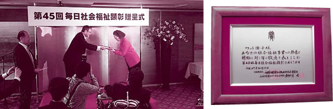2004年(平成16年)11月22日、彩の国コミュニティ協議会(埼玉県)にてシラコバト賞を頂きました。埼玉県でのボランティア活動の部、あけぼの会埼玉支部長として10年以上継続しているボランティア活動での貢献に対する表彰でした。