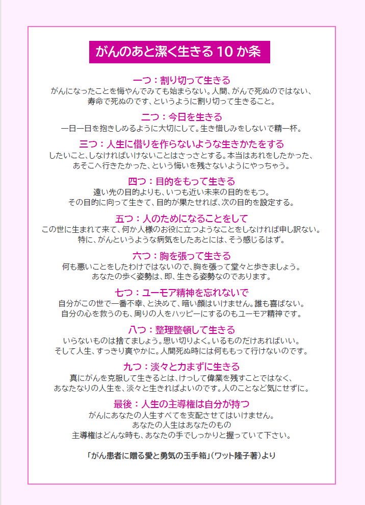 勝俣先生が、Facebookで全国大会の事前予告を2回、大会の始まる寸前に「今から始まりますよ」と呼びかけて、それに応じて当日来て下さった人が何人もいました。その中にはNHKさんもいてビックリしました。最後のアップは【ワット隆子さんと。今回は47周年で50周年まで、頑張りたいとのことです!】と、プログラムの裏表紙の「がんのあと潔く生きる10か条」と会長と二人のツーショットを載せておられました。「イイネ!」がたくさん来て、「素敵な生き方の10か条」とか「10か条すばらしいですね」とか、「10か条を読んで考え方、生き方を変える」とかのコメントがありました。会員は見慣れている10か条ですが、初めて目にされる方には新鮮で強烈な印象を与えたようでした。