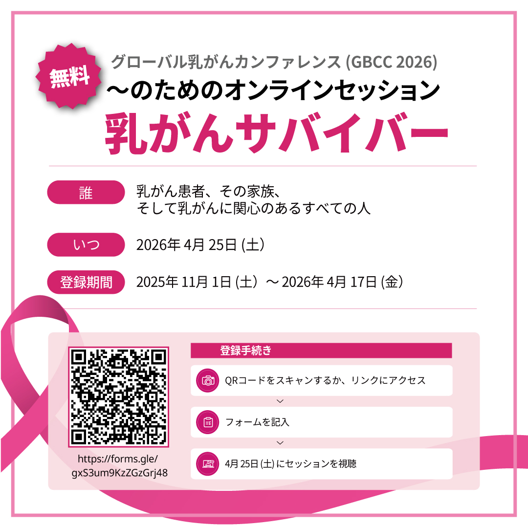 グローバル乳がんカンファレンス GBCC2026 に関連し、乳がんサバイバーやご家族、関心のある方を対象とした無料オンラインセッションのご案内です。