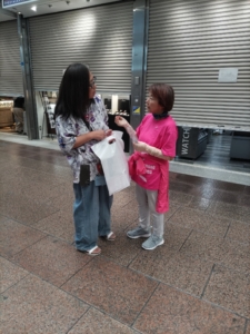 三宮センター街を行き交うスーツ姿の男性にも思いきって声を掛け、袋を差し出したところ「奥さんにも渡すけど、会社にも持って行くよ」と言って受取ってくださいました。高校生には、家に帰ったら大切なお母さんに「検診に行ってね」と言うように伝えました。「私も過去、乳がんの手術をしたのよ」とお話してくださる方や、「もう、ピンクリボンの時期なのね」など乳がん月間のピンクリボン活動が浸透しているように感じました。