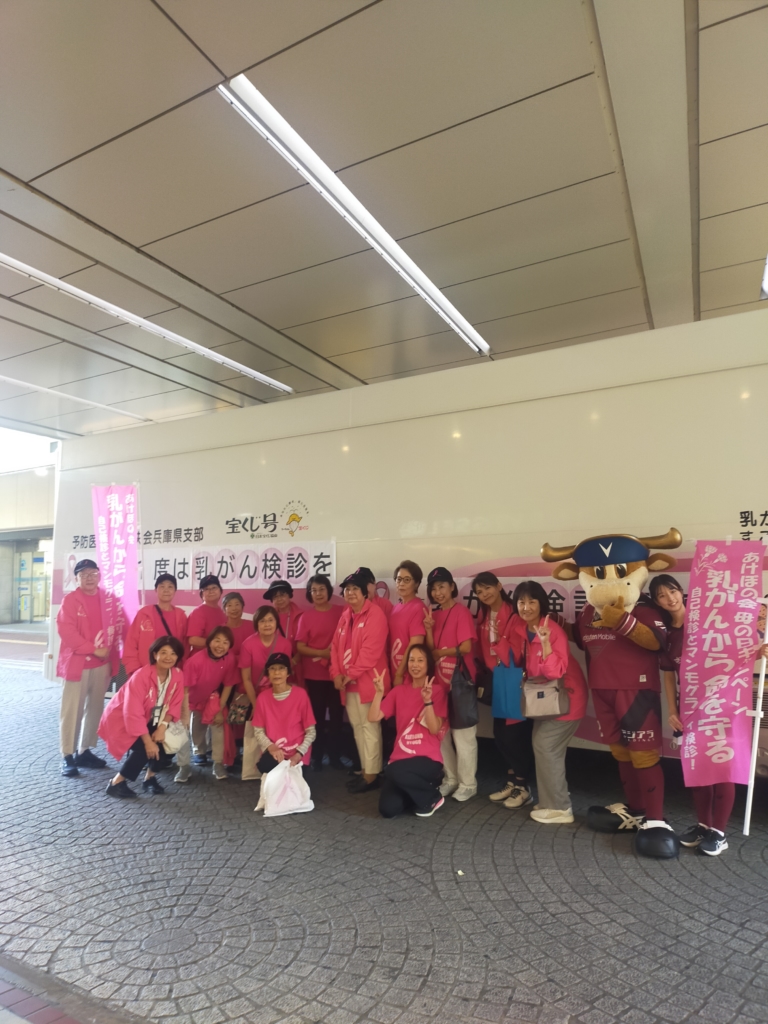 兵庫県予防医学協会の協力のもと、今回もマンモグラフィー検診車を出していただき、道行く人にマンモグラフィー検診を呼びかけました。袋を受取った方が「私、該当しているわ!」と話され、数名の方がその場で検診を受けてくださっていました。